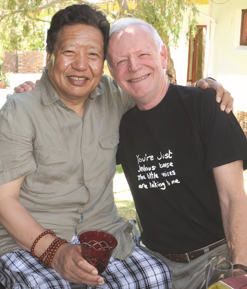 This deep love and appreciation of Rob is shared by the thousands whose lives he has touched. I met Rob in Nieu Bethesda where he lived and ran a dharma retreat centre, in the mid ’80s. He taught me everything I know about mindfulness, meditation and mind training. It was Rob’s insight training that enabled me to become present with my thoughts. In his words, ‘being aware of what is happening while it’s happening’, helped transform crippling anxiety I had suffered since childhood. I too owe him an enormous debt. He led me to the dharma and my guru Choje Akong Tulku Rinpoche, pictured above with Rob and affectionately known as The African Lama.
