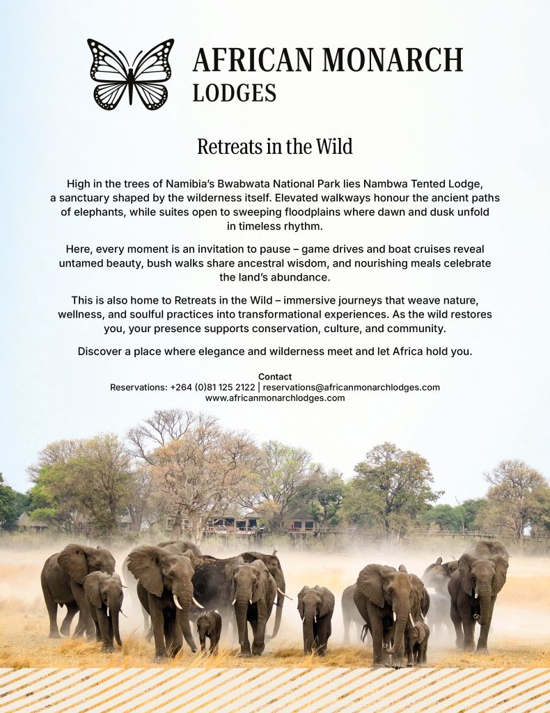 Based in Namibia, African Monarch Lodges offer eco-conscious, slow-travel experiences that give its guests the opportunity to find luxury in the pause. Through its unforgettable safaris on foot, by boat and vehicle, guests aren’t just brought into the presence of some of the biggest herds of elephants, lions, leopards, wild dogs and 450+ species of birds, but are encouraged to cultivate quiet presence.