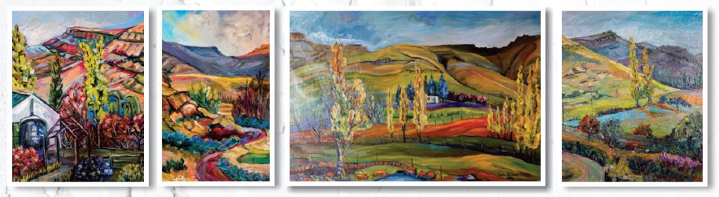 “I have always painted, with oils on canvas,” says Sandra. “ I absolutely LOVE colour! I don’t sketch before I paint my pieces. They are crafted purely with colour. I simply apply layers of colour reflecting what I see. Rhodes, our home, is magical. The natural beauty of mountains super-special,” she adds.