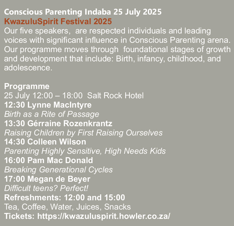 Conscious parenting encourages parents to understand deeply their own emotions, triggers and beliefs and how these influence their children. Too often children serve as mirrors of their parents’ forgotten self. This indaba features: Megan de Beyer, Lynne MacIntyre, Gérraine Rozenkrantz, Colleen Wilson and Pam MacDonald.