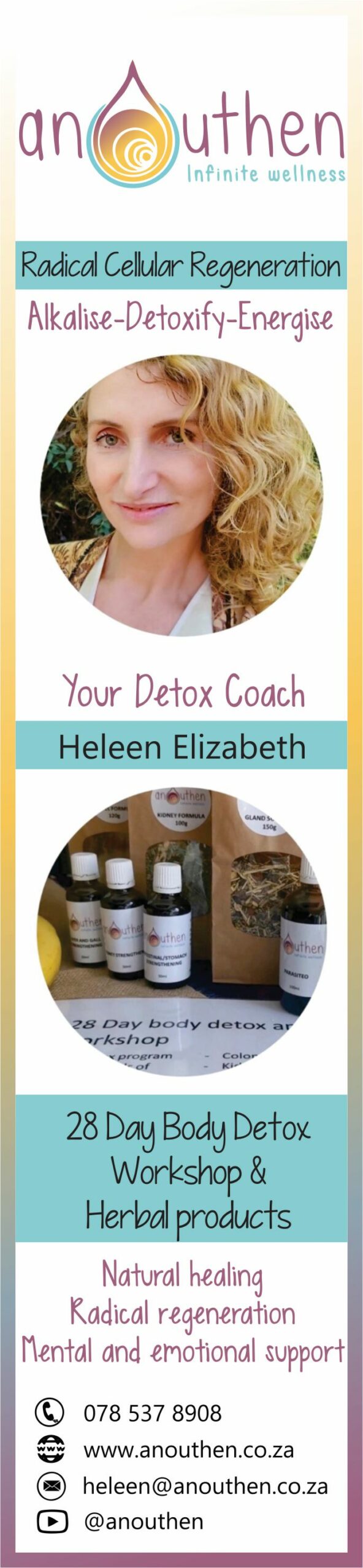 Heleen Elizabeth has been a detox coach for five years, facilitating people’s introduction to healing with fruits on a cellular level. An experienced detoxer and at first a sceptic herself, she committed to a fruit detox to prove the concept wrong. The resulting healing she experienced way surpassed any healing she experienced before. She could not keep this to herself and started propagating a fruit-based detox to heal, until this day. She facilitates on-line group based detoxes on her platform Anouthen Infinite Wellness.