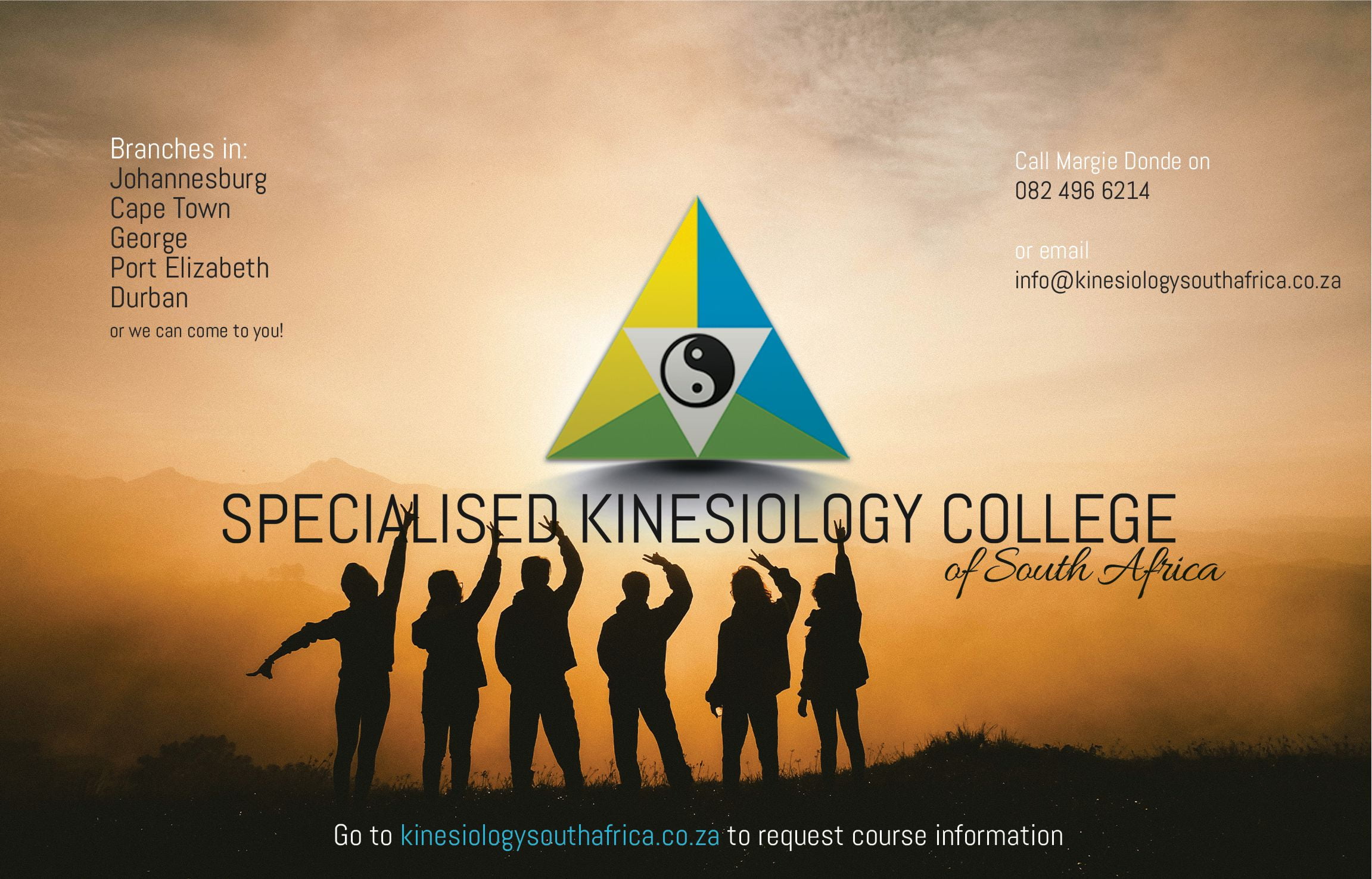 We teach in KZN, Johannesburg, George and Cape Town and, of course, we can always come to you provided that we have enough students to do so. www.kinesiologysouthafrica.co.za to request course information or call Margie Donde on 082 496 6214, info@kinesiologysouthafrica.co.za