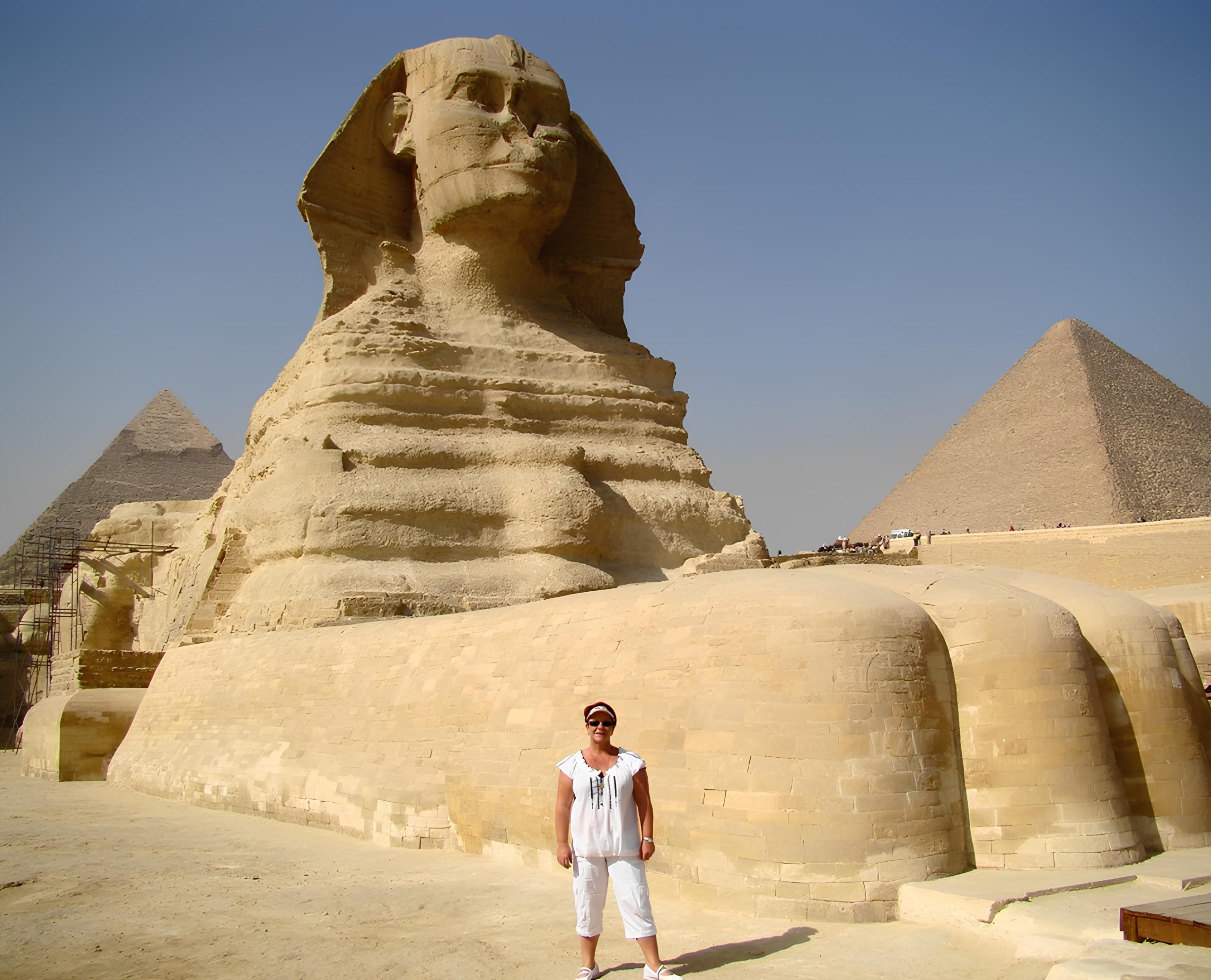 “With special permission from the Egyptian Director of Antiquities, our group was both blessed and privileged to do the oneness meditation between the paws of this guardian and observer, at the dream gate. In a dream state under the hot Egyptian sun, below the lion’s head of this ancient sculpture formed out of a single block of stone, I went within. I cannot recall much of that meditation, other than being overwhelmed by an intense connection with all galactic energies and Earth energies. What transpired energetically shall remain a mystery, for within that dream state I have no recall. What followed was mind-blowing… As I emerged from between the paws of the Sphinx bright gold beams of energy spiralled from the head and body of the Sphinx, all of the mineral energy and vibration pulsating against the turquoise sky.”