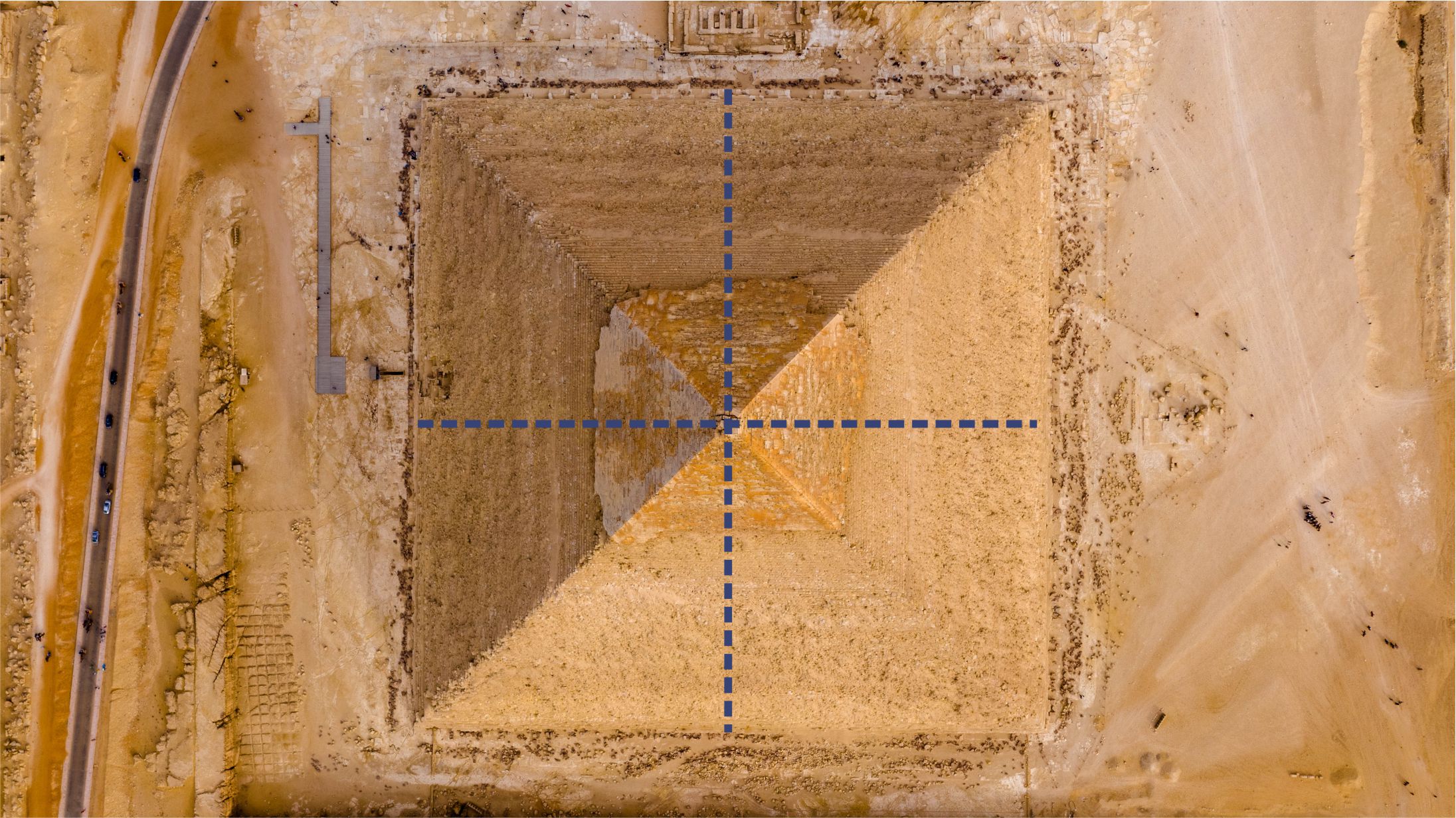 Now on the topic of signatures, most would say they are unaware that the great pyramid is eight sided. It was discovered quite by accident in 1940, when a British Air Force pilot, P. Groves, was flying over the pyramid. He happened to notice the concavity and captured it in the now-famous photograph. From a birds-eye view during the equinox and solstices, it can be noticed the pyramid has eight divisions.