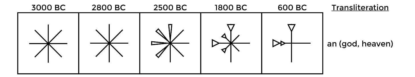In Sumerian cuneiform this ideogram was the word An (‘sky’ or ‘heaven’); its use was then extended to a logogram for the word diĝir ‘god’ and the supreme deity of the Sumerian pantheon (‘An’ or ‘Anu’). It is also chronologically correct as the time period would indicate an approximation of awareness of this symbol’s prior use.
