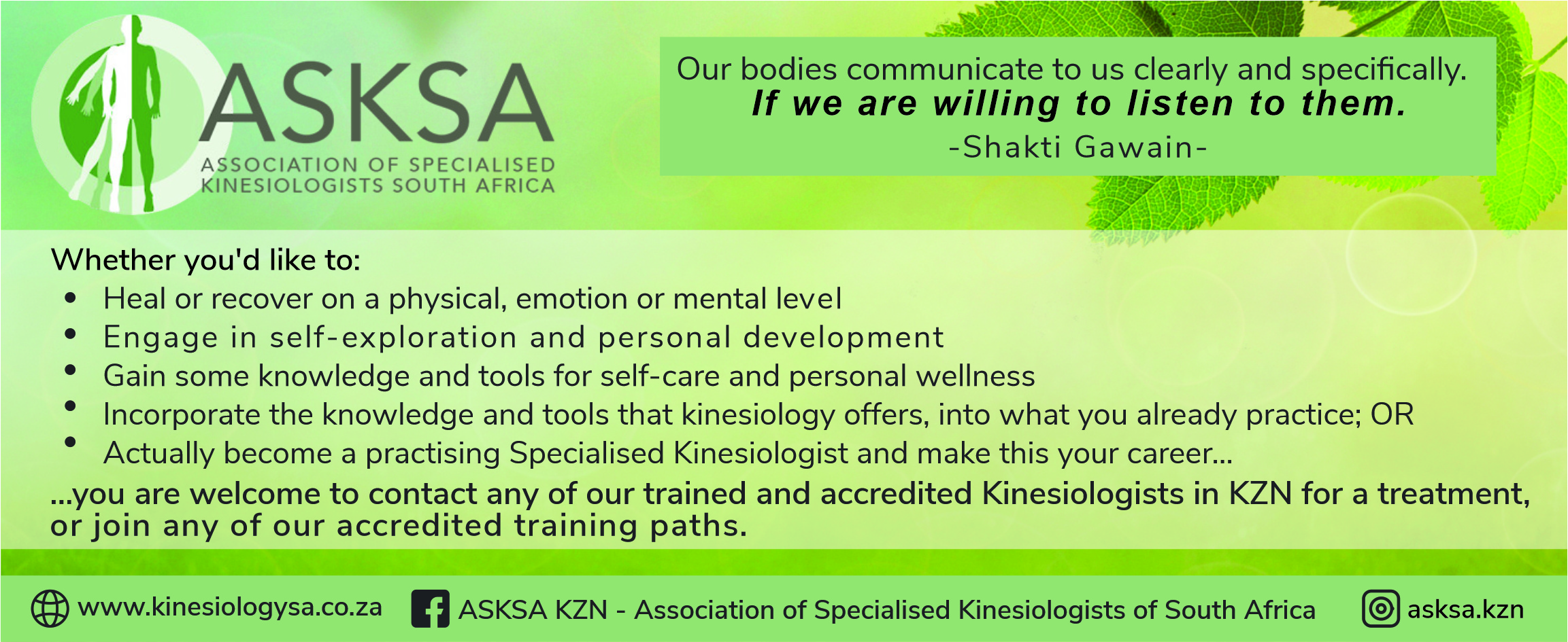 There are two ways of studying kinesiology in South Africa and these courses have many benefits at all levels, as you can: Engage in some self-exploration and personal development in your life and health; gain knowledge and tools for self-care and wellness at home; incorporate the knowledge and tools that kinesiology offers into what you already practise; or actually become a practising specialised kinesiologist and make this your career. Please visit https://www.kinesiologysa.co.za/ or contact our instructors (in advert) for more information.