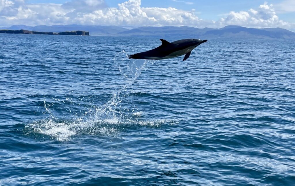 It was while tending the garden here recently that my friends Dell Horler of Cape Town, now living in Findhorn, veteran Dutch skipper Frank van Beuningen and Scots sailor Jonathan Caddy, son of legendary Findhorn co-founders Eileen and Peter Caddy, arrived aboard the vintage racing yacht Hestia. They were greeted and welcomed by a pod of exuberant dolphins, with Frank capturing the amazing high-flying leap depicted here.