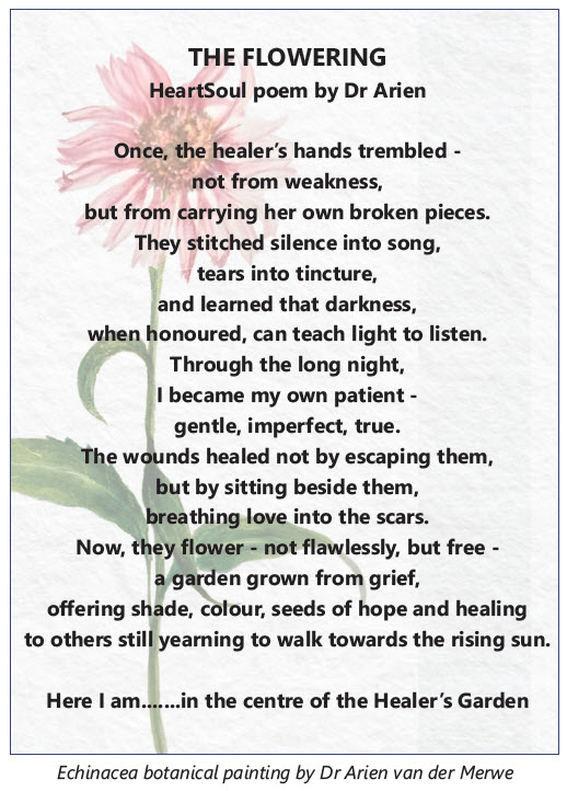 “To all Odyssey readers, I share my HeartSoul journey with you, to acknowledge my ongoing process from wounded healer with depression, i.e. healer heal thyself, to freely blossoming healer-lightworker to help self and others.” Dr Arien van der Merwe