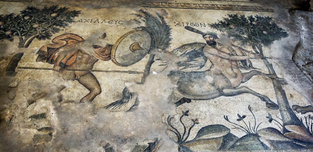 Main pic: A mosaic depicting a warrior pursuing the centaur Chiron right at the Haleplibahce Mosaic Museum at Sanliurfa Urfa in south-eastern Turkey