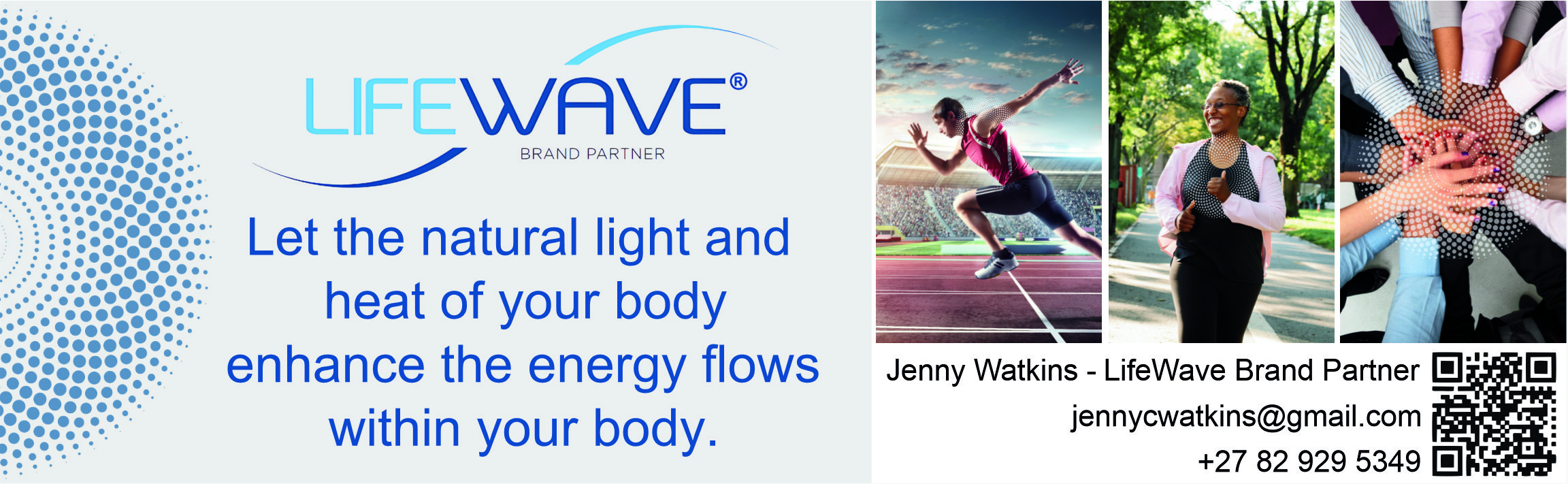 I am a Consciousness Facilitator and Empowerment Coach, working with various consciousness tools and techniques. My passion is to contribute to people who wish to experience happier lives and healthier bodies. I have studied many different natural methods and modalities for over 25 years and when I was introduced to the LifeWave technology and read and heard the many different testimonials of what was changing in the lives of people and the improvements in their health, I knew this was something that I would like to be involved with. If you have any questions, please feel free to contact me via email: jennycwatkins@gmail.com You can do additional research here: www.thisisitinfo.com and www.lifewave.com