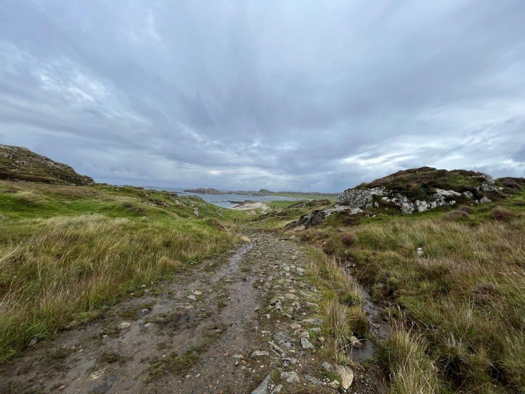 Just as I thought that I had given up on the Druid stones, I discovered there was an area on the island that I could visit and, with directions in hand, I set off towards St. Columba beach. Doggedly determined to find the way, I decided to follow another path. It got quite wet and I took off my hiking shoes as it was difficult to walk with them already sopping wet. The bliss of walking without shoes!